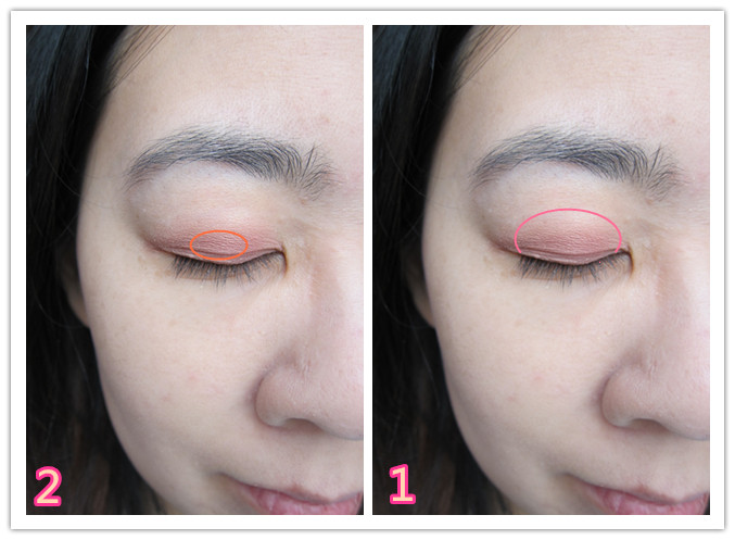 之後再用3號色的玫瑰粉色在眼頭和眼尾加深效果,再配合4號的珠色粉色塗抹在下眼尾和內眼角,令到雙眼不但有放大閃爍的效果,也令到眼部輪廓更明顯。
